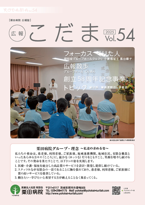 栗田病院がお届けする広報誌『こだま』は、部署の紹介や現場で働く職員紹介、法人の取り組みを掲載しています。